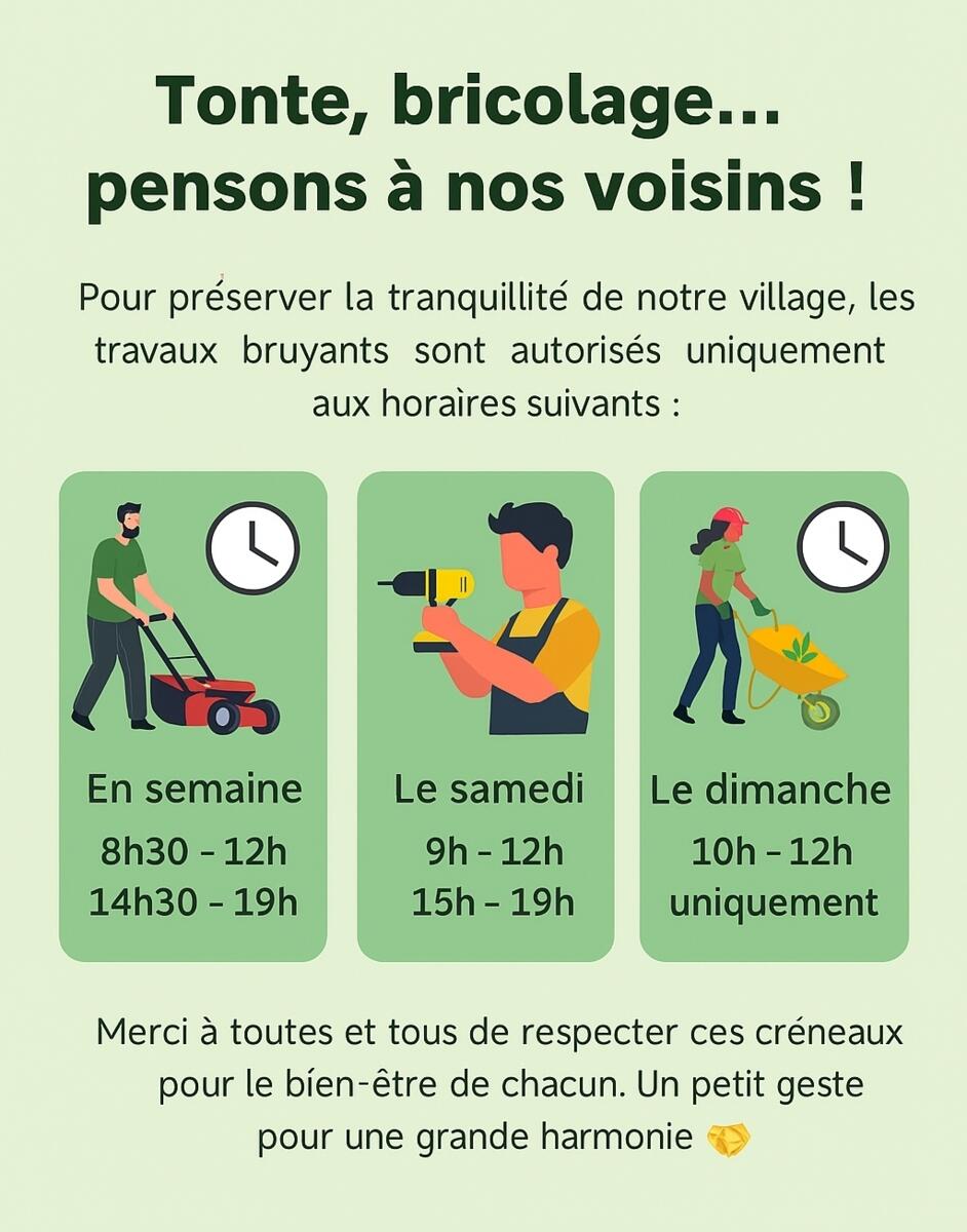 Pour préserver la tranquillité de notre village, les travaux bruyants sont autorisés uniquement aux horaires suivants :
