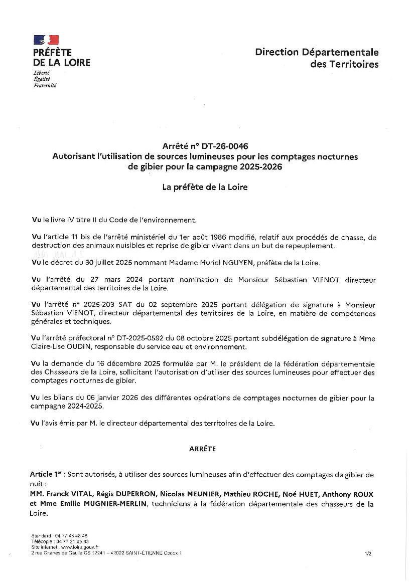 Nous tenons à vous informer que nous procéderons à un comptage de lièvres sur une partie de votre commune entre le 23 et le 27 février. Les arrêtés préfectoraux correspondants sont joints.