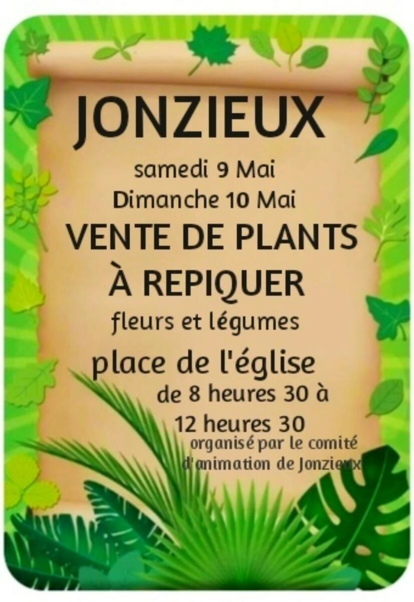 Vente De Plants À Repiquer 17/04/2026 Le comité d'animation de Jonzieux organise une vente de plants à repiquer: - Le samedi 9 et dimanche 10 mai - de 8h30 à 12h30 Sur la place de l'Eglise.