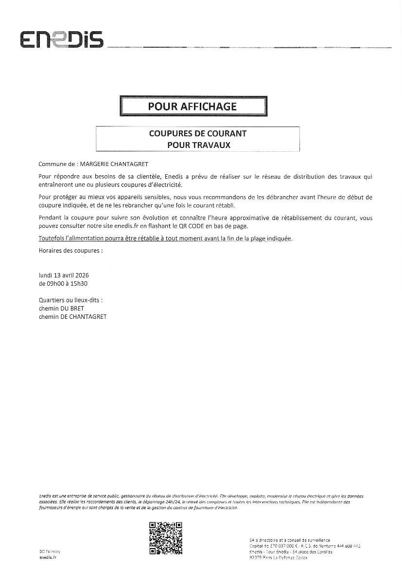 Coupure de courant pour travaux Lundi 13 avril