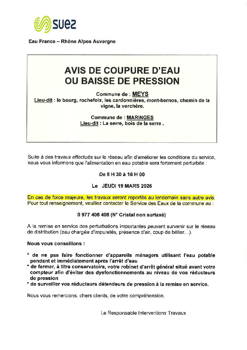 Avis De Coupure D'eau - Secteur La Serre 12/03/2026 Suite à des travaux sur le réseau, SUEZ nous informe d'une coupure d'eau (ou baisse de pression) le jeudi 19 mars de 08h30 à 16h00. Secteurs concernés: La Serre, bois de la Serre.