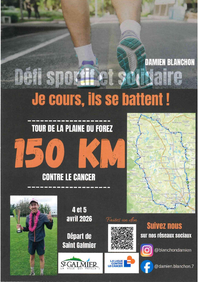 Samedi 4 et Dimanche 5 avril , il va courir 150 km autour de la plaine du Forez pour lever des fonds pour la Ligue contre le cancer, en hommage à sa sœur et à toutes les personnes qui se battent.