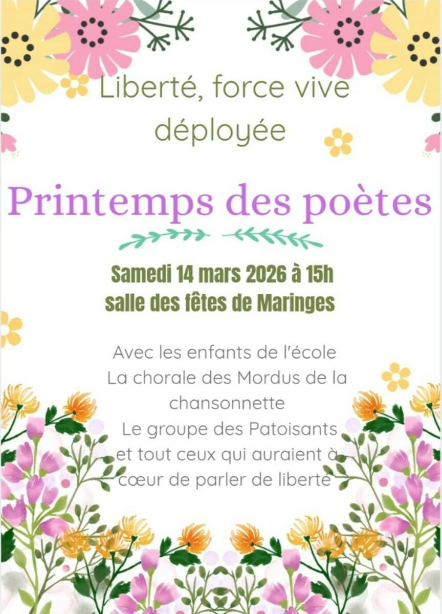 Rappel Printemps Des Poètes - 14 Mars 2026🌸💮 11/03/2026 Pour rappel, le printemps des poètes, c'est ce samedi !!! Rendez-vous à 15h ce samedi 14 mars à la salle d'animation rurale Venez nombreux!!!🌺🏵🌻