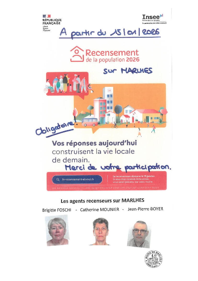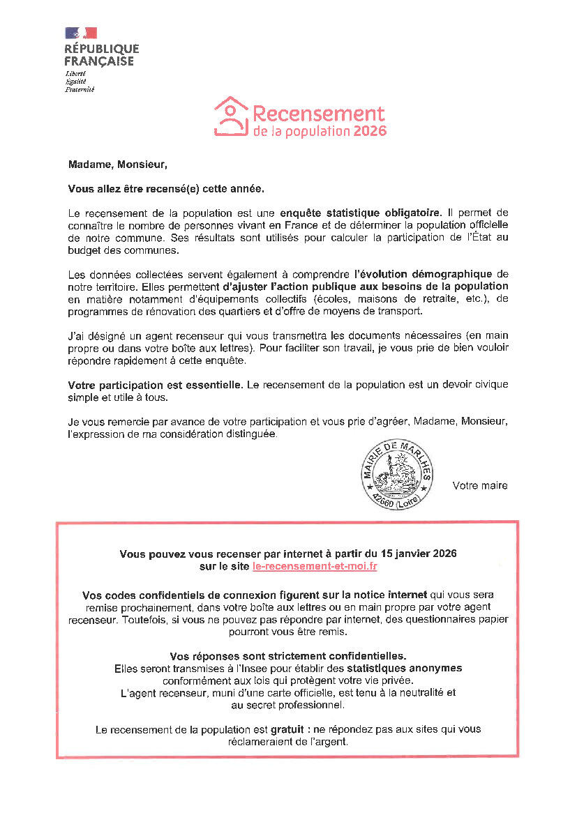 Le rencensement internet sur le site le-recensement-et-moi.fr commencera le 15/01; vos codes confidentiels vous seront remis par les agents recenseurs (dans la boîte aux lettres ou en mains propres).
