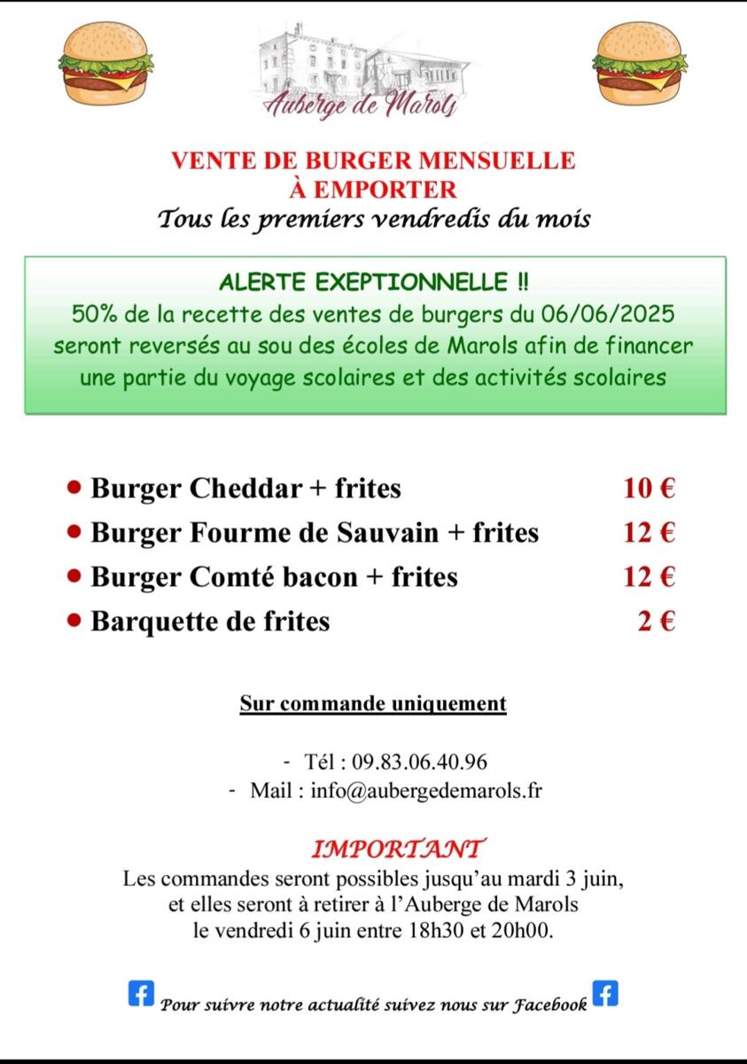 En juin (le 6), la traditionnelle vente de burgers de l'Auberge de Marols se fera au profit du Sou des Ecoles afin de contribuer au voyage scolaire de fin d'année.