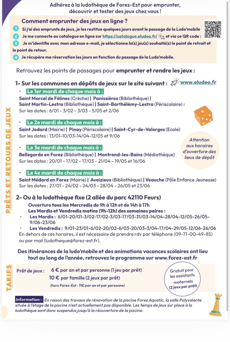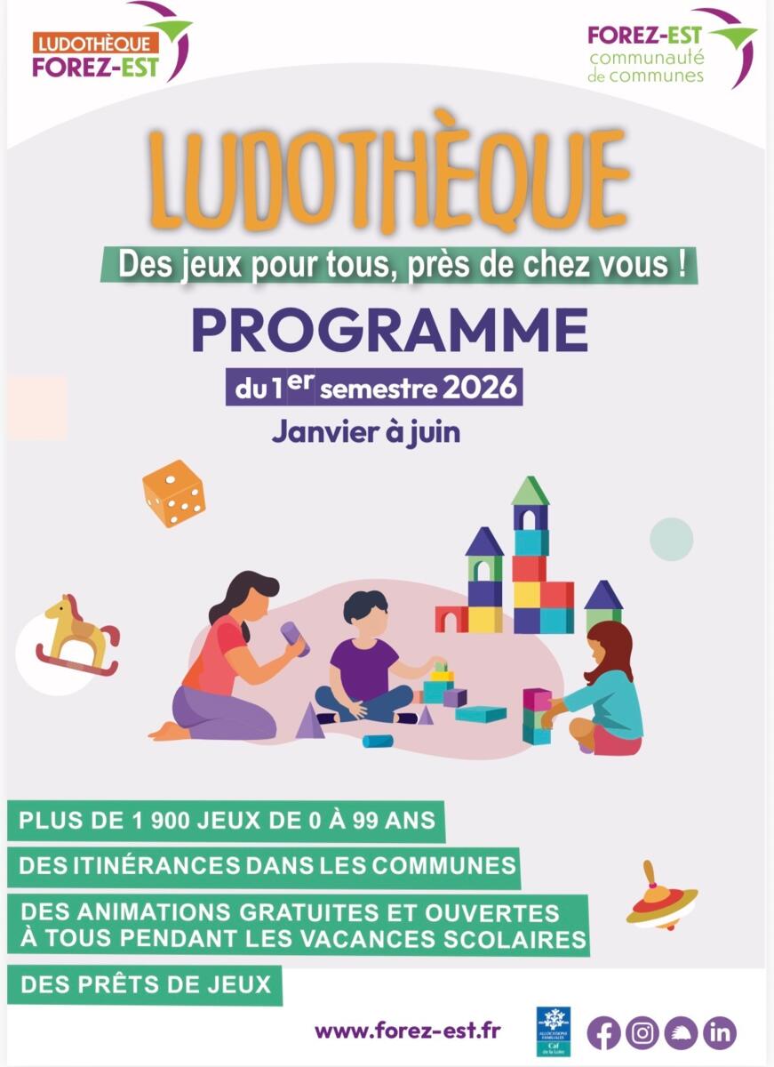 Vous pourrez retrouver la ludothèque à Feurs pour emprunter des jeux et jouets. L'adhésion annuelle est à 6€/ an (1 jeu toutes les 4 semaines) et 10€/an (2 jeux toutes les 4 semaines).
