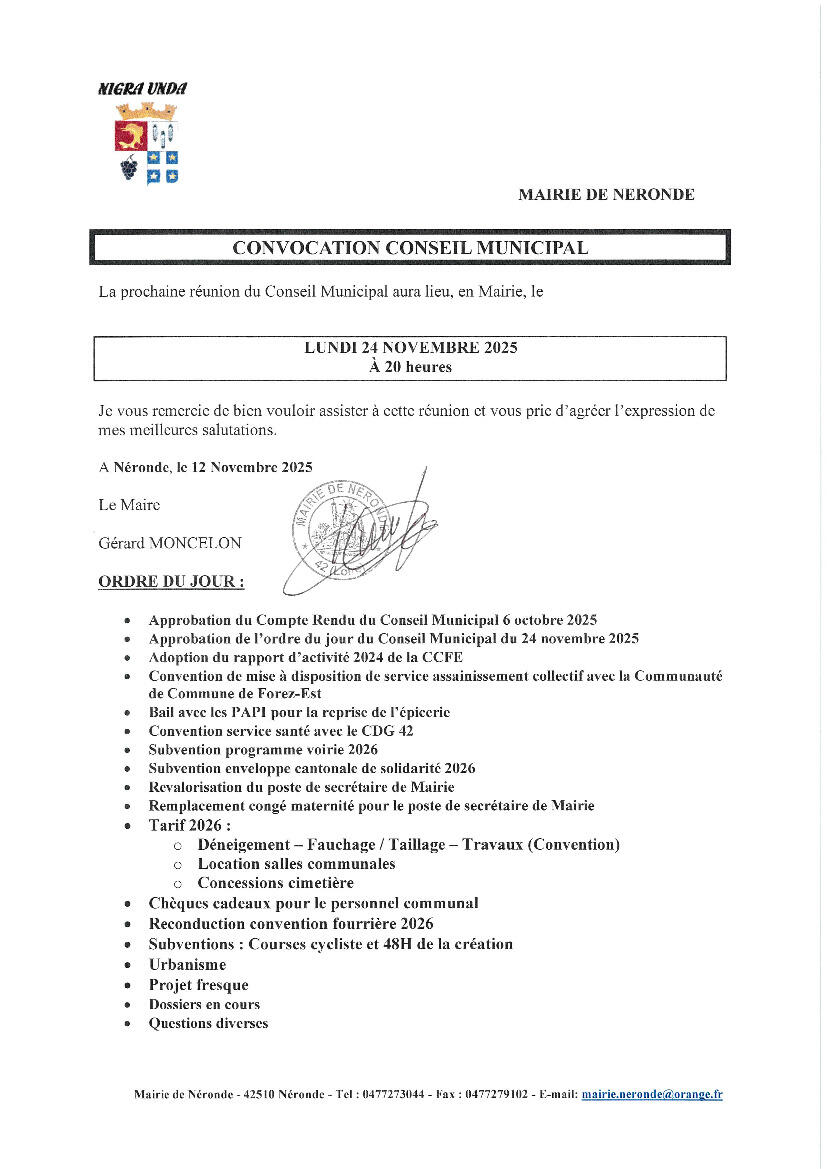Prochain Conseil Municipal 19/11/2025 Le prochain Conseil Municipal se tiendra le Lundi 25 novembre à 20:00 Salle du conseil Les séances du conseil municipal sont publiques