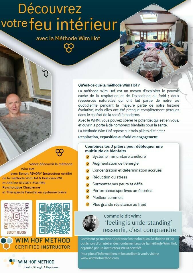 Contact et réservations : Scanner le QR code sur le flyer ou RDV sur le site https://www.wimhofmethod.com/instructors/benoit-rivory