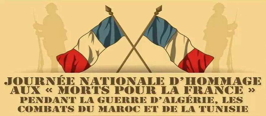 Ce jeudi 19 mars, retrouvons-nous à 11h00 au monument aux morts de Pélussin, pour la journée nationale du souvenir et de recueillement à la mémoire des victimes civiles et militaires de la guerre d'Algérie et des combats en Tunisie et au Maroc.