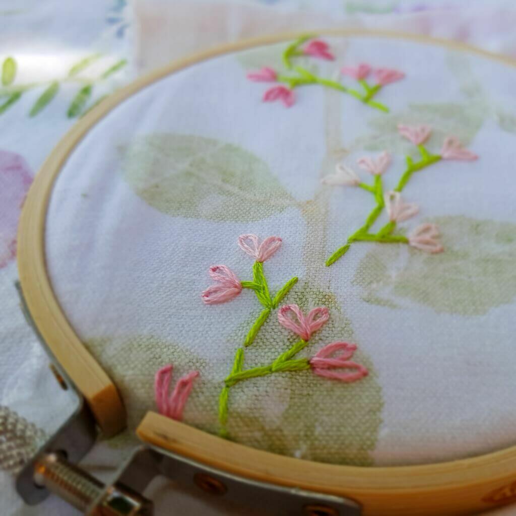 Atelier de confection d’une pochette en tissu embelli par impression naturelle et broderie