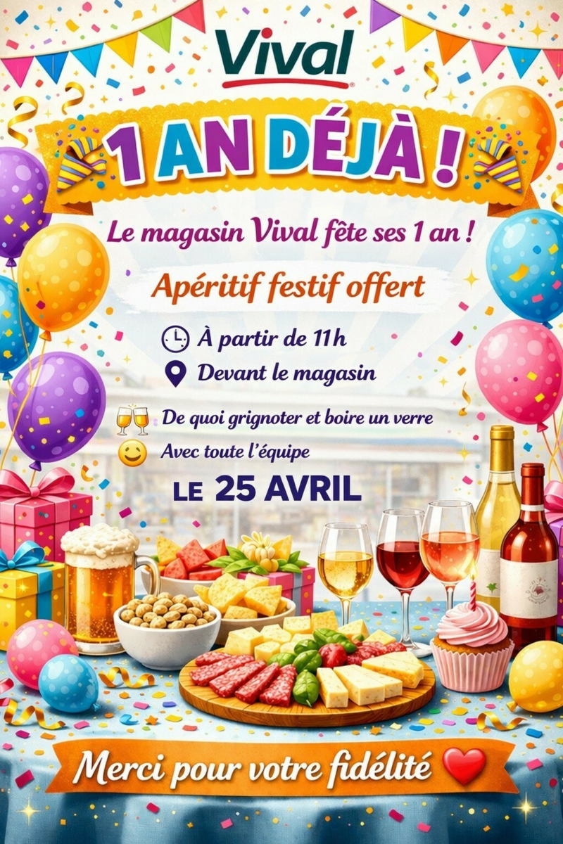 Le 25 avril 2026, à partir de 11h00, venez fêter le premier anniversaire de votre magasin Vival autour d'un apéritif offert.