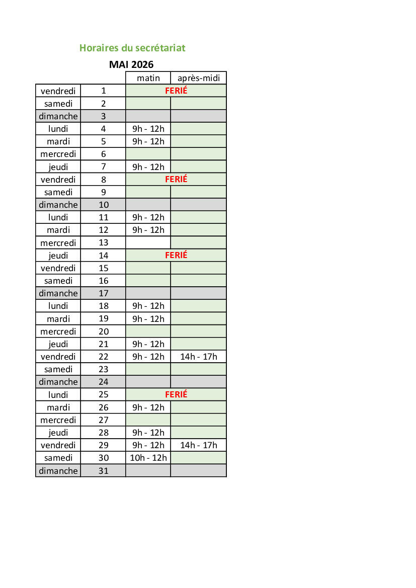 Vous trouverez ci-joint le tableau des jours et heures d'ouverture du secrétariat de la Mairie pour le mois de mai.
