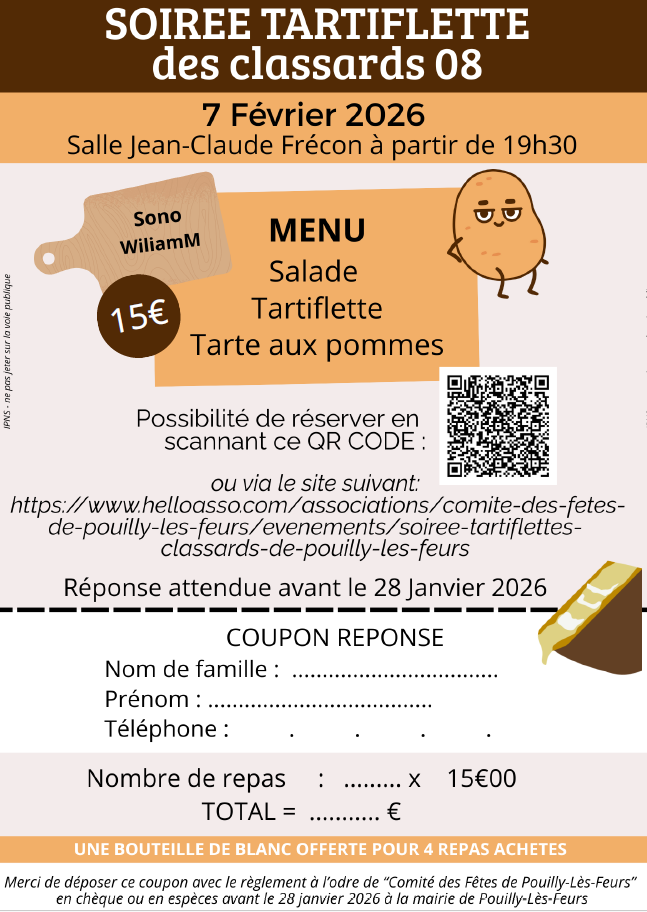 Soirée Tartiflette 🥔 des Classards - le 07 février - 19h30 23/01/2026 Source : Mairie de Pouilly-Lès-Feurs
