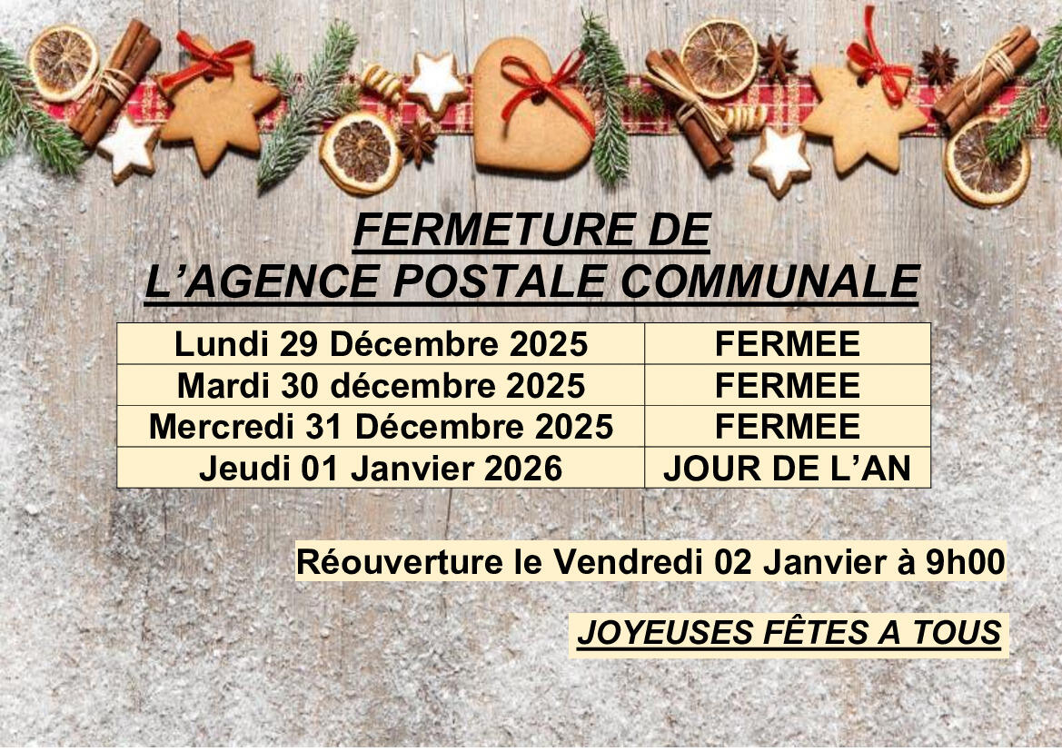 Fermeture Agence Postale Communale Fêtes de fin d'année 15/12/2025 . Source : Mairie de Saint-Martin-Lestra