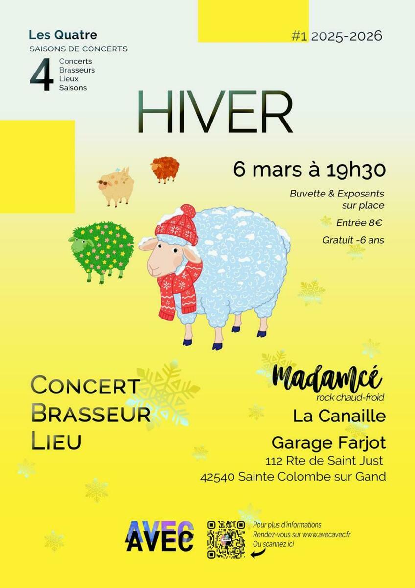 RAPPEL : Les 4 saisons de concerts 28/02/2026 Venez nombreux ! Le 6 mars à 19h30 Garage FARJOT 42540 Sainte Colombe sur Gand Source : Mairie de Saint-Cyr-De-Valorges