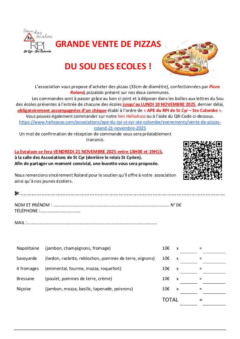 GRANDE VENTE DE PIZZAS DU SOU DES ECOLES !