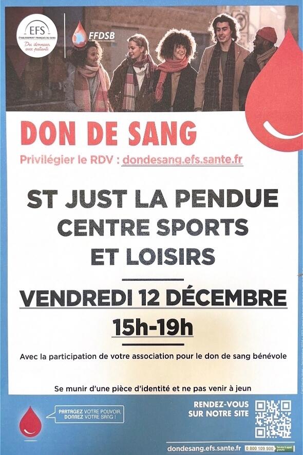 Don du sang 10/12/2025 Vendredi 12 décembre 15h00 - 19h00 Centre de Sports et Loisirs Saint Just la Pendue Source : Mairie de Saint-Cyr-De-Valorges
