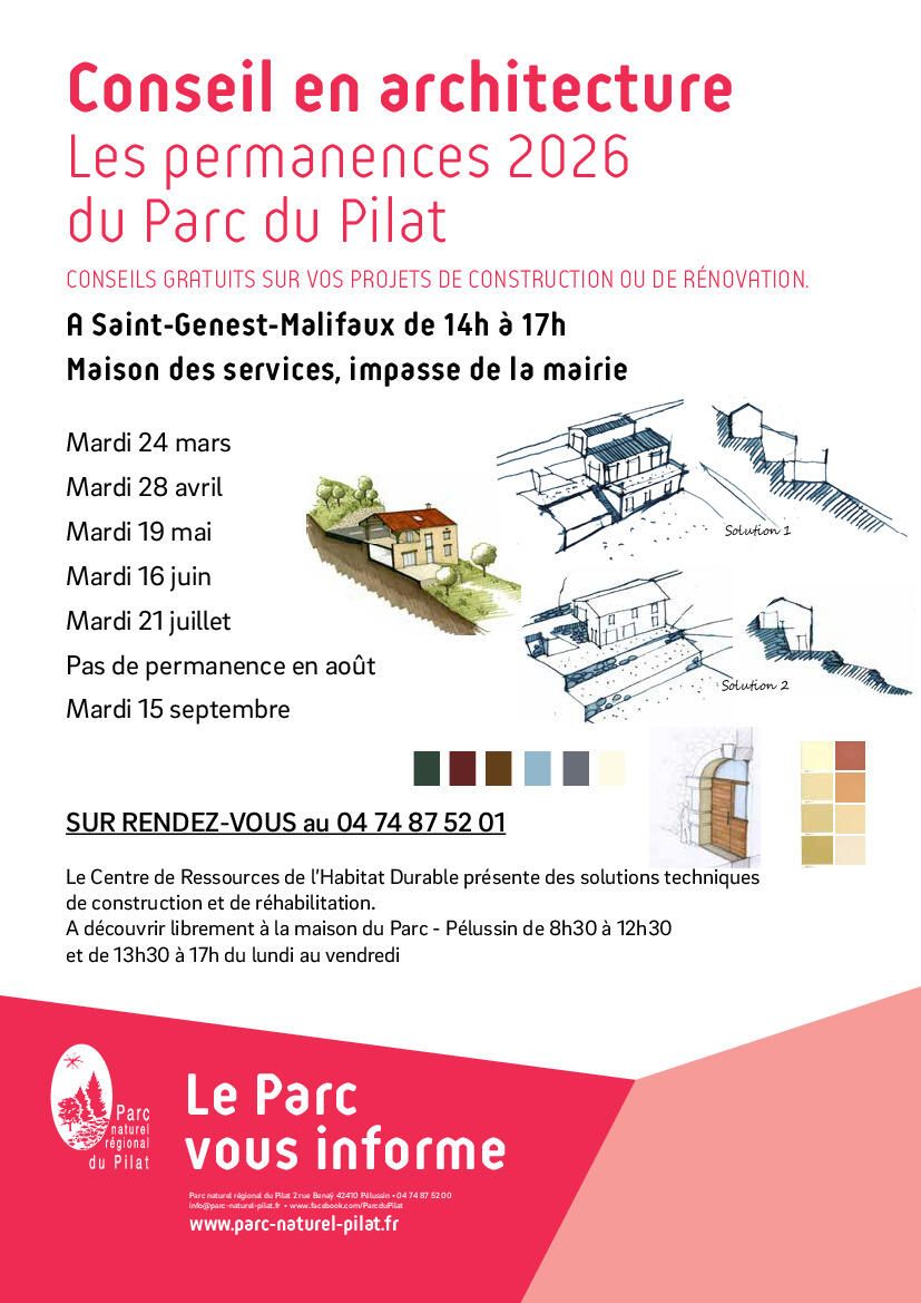 Permanences 2026 De L'architecte Du Parc 11/03/2026 Comme chaque année, le Parc propose un conseil en architecture auprès des particuliers. Il s'agit de conseils gratuits, sur rendez-vous (04 74 87 52 01), lors de permanences mensuelles sur le territoire.