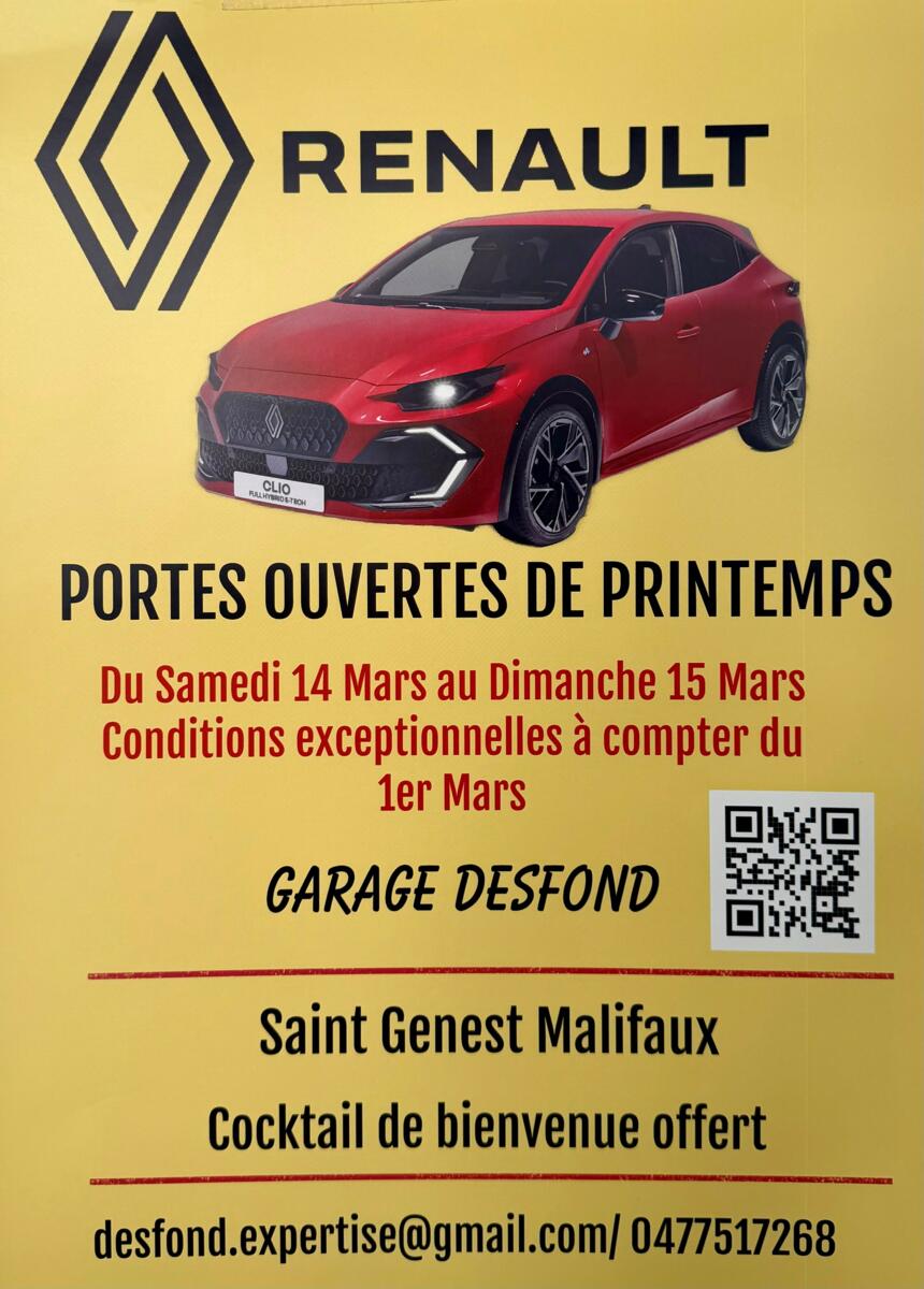 Portes Ouvertes Garage Desfond 13/03/2026 Portes ouvertes au Garage Desfond ce week-end, venez découvrir la nouvelle Clio 6