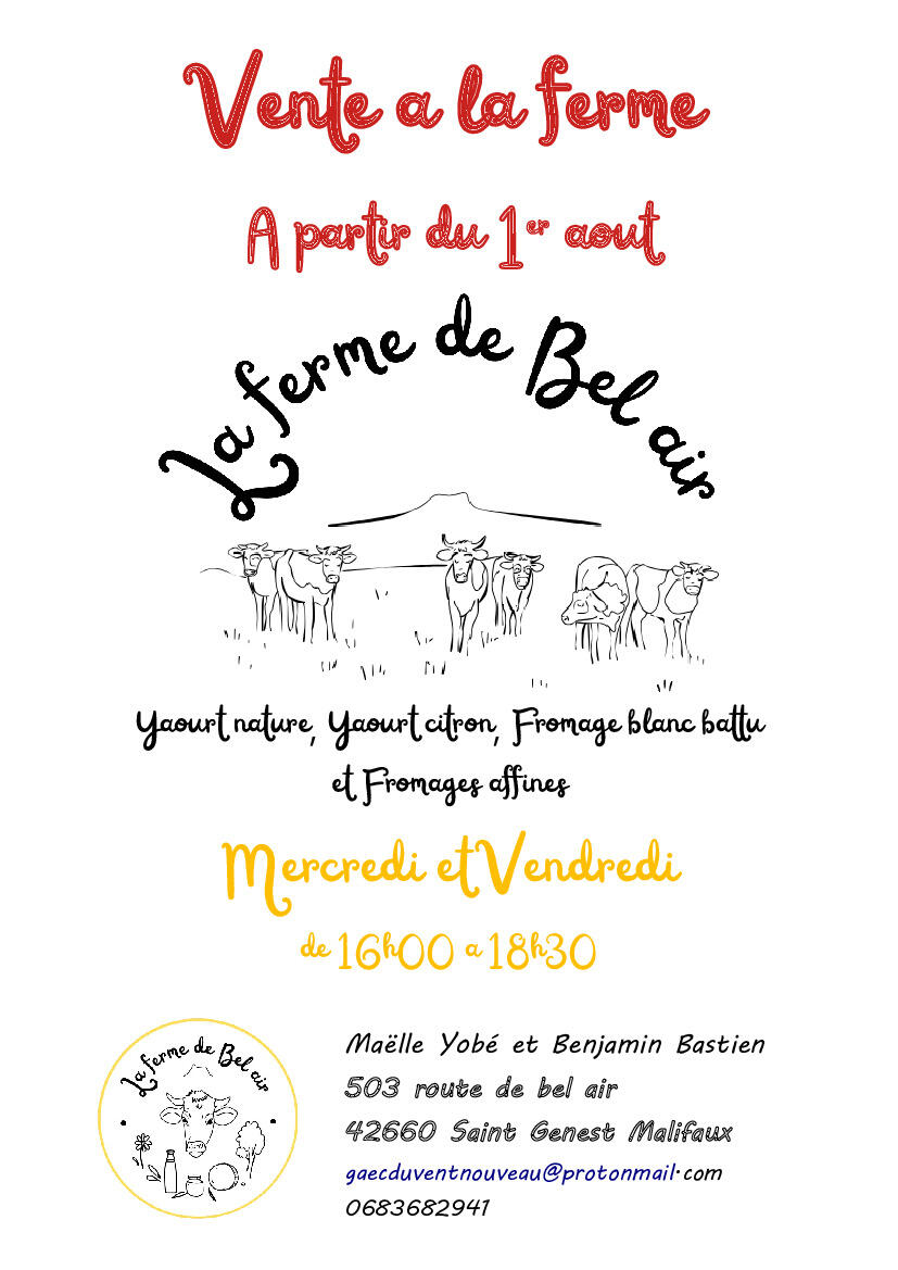 "Venez découvrir nos produits laitiers (Yaourts, fromage blanc battu...) bio dès le vendredi 1er août de 16h00 à 18h30 et par la suite les mercredi et vendredi à la même heure. Vous pourrez profiter de ce moment pour voir la traite des vaches. A bientôt !"