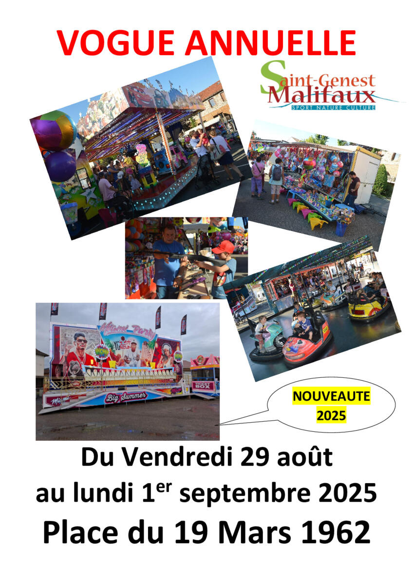 La vogue de Saint-Genest-Malifaux aura lieu du Vendredi 29 août au lundi 1 er septembre 2025