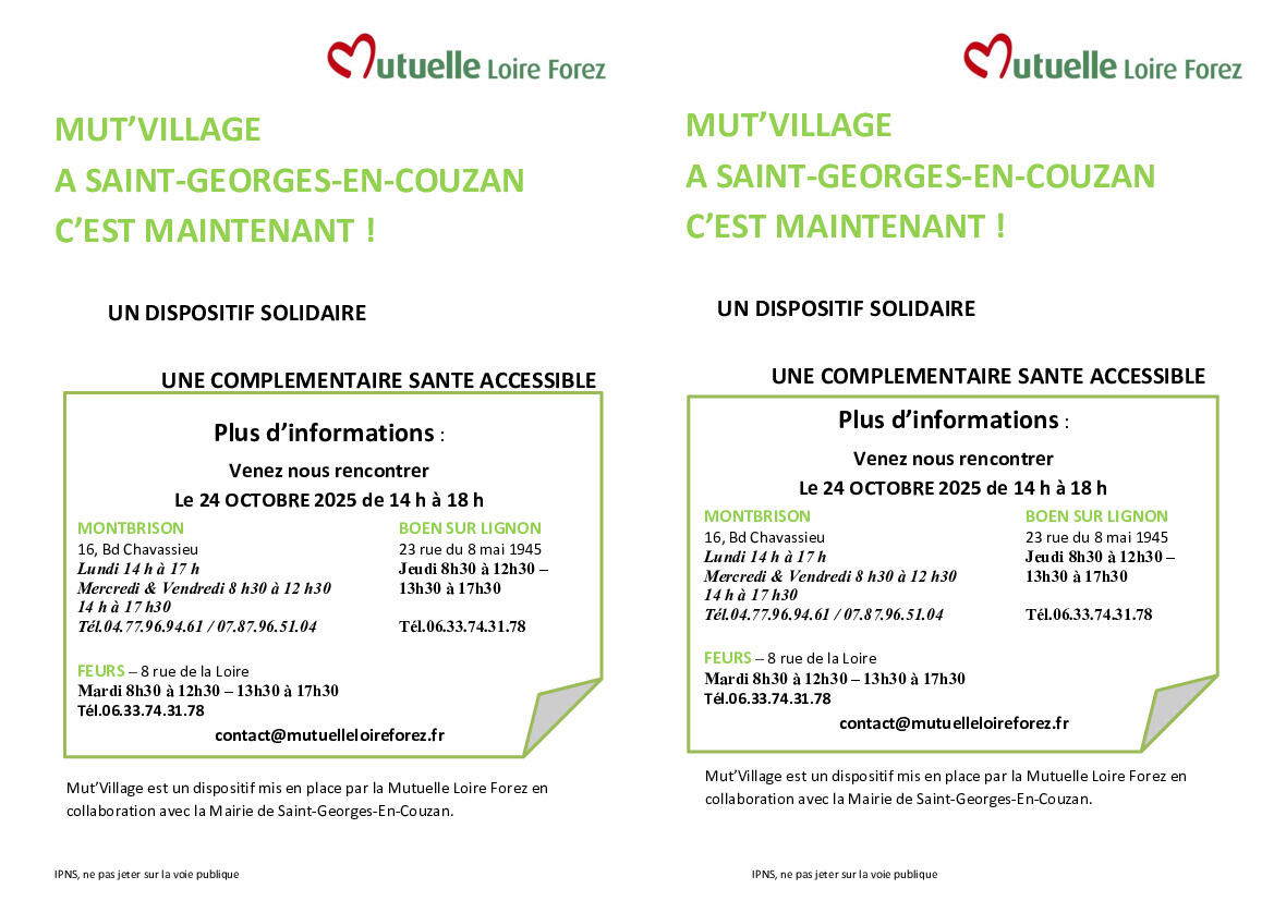 Une permanence de la mutuelle Mut'Village aura lieu le vendredi 24 octobre de 14h à 18h à la mairie de Saint Georges en Couzan