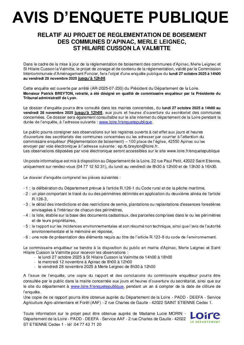 Enquête publique règlement de boisement du 27 oct au 28 nov