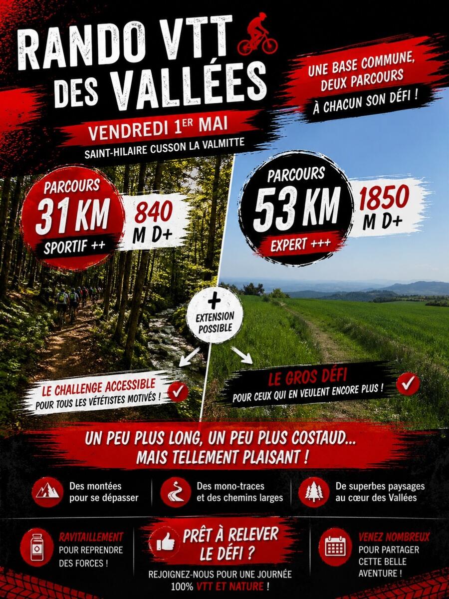 L'association St Hilaire Evasion Sportive vous attend nombreuses et nombreux pour la traditionnelle randonnée VTT des vallées le vendredi 1er mai 2026 pour découvrir ou redécouvrir les beaux chemins de St Hilaire 🚴☀