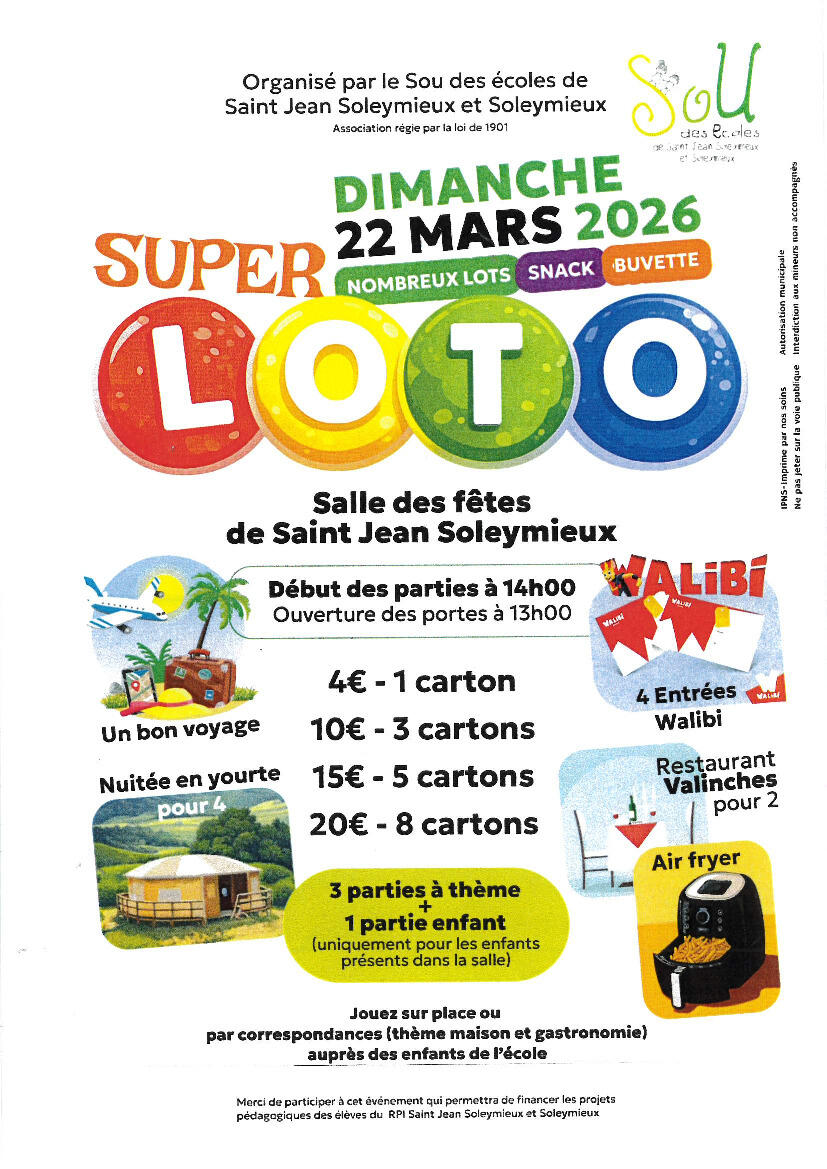 Dimanche 22, super loto du Sou des écoles 06/03/2026 A la salle des fêtes à partir de 14h. Lots fantastiques à gagner !