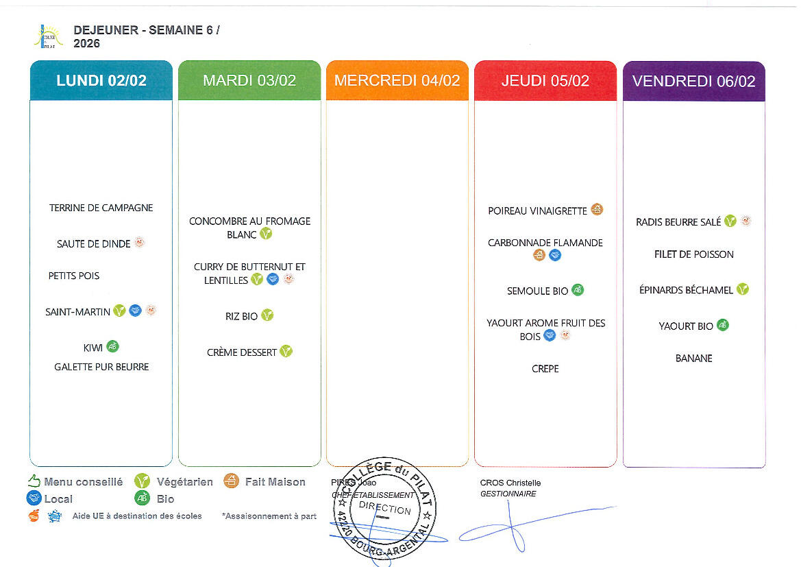 Menu du 02 au 06 février