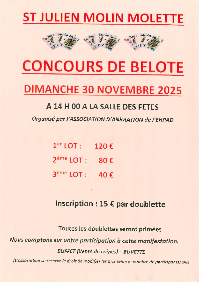 Concours De Belote 29/11/2025 L'association d'animation de l'EHPAD du Val du Ternay organise son concours de belote, ce dimanche à partir de 14 heures au rez de chaussée de l'espace Michèle Bernard.
