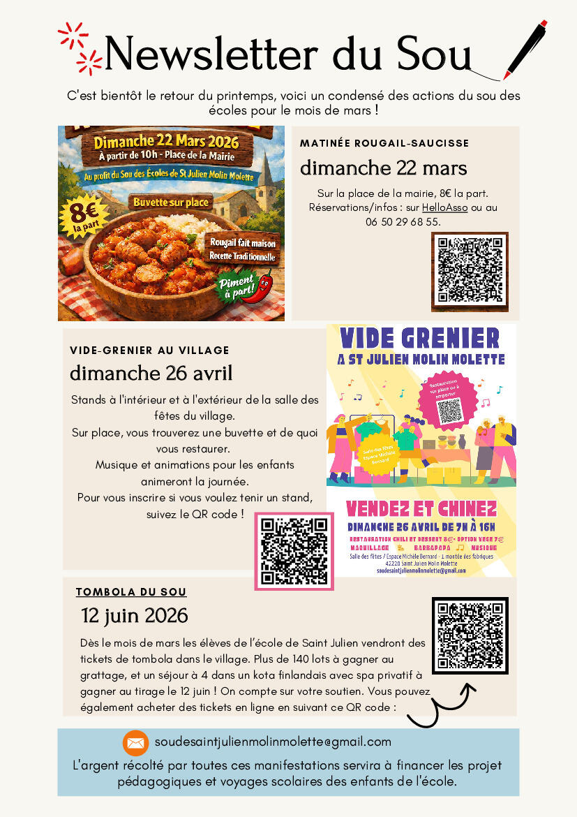 Rougail Saucisses/Vide Grenier Et Tombola 07/03/2026 Les supers Rendez-vous du Sou... On compte sur vous !