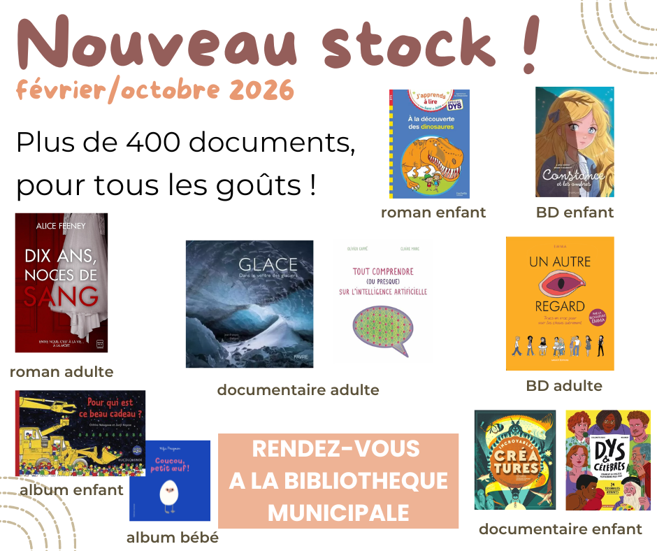 Découvrez les nouveautés à la bibliothèque 20/02/2026 Vous pouvez pousser la porte de la bibliothèque le mercredi de 16h à 18h et le samedi de 9h30 à 11h30.
