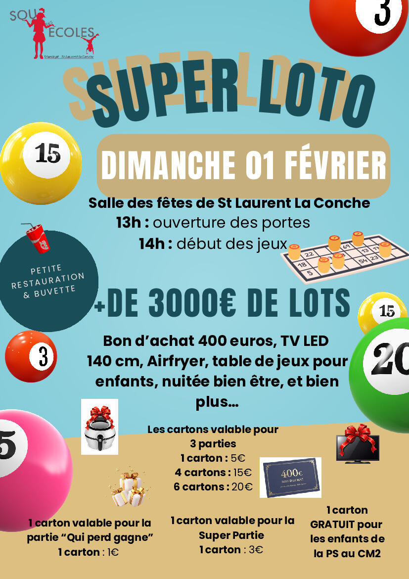 SUPER LOTO SOU DES ECOLES 14/01/2026 LE LOTO DU SOU DES ECOLES AURA LIEU LE DIMANCHE 1 FEVRIER A PARTIR DE 13H A LA SALLE DES FETES DE SAINT LAURENT LA CONCHE.