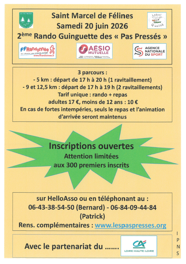 2ème rando guinguette avec les Pas Pressés 17/04/2026 Rendez-vous le samedi 20 juin. Attention, inscriptions limitées.