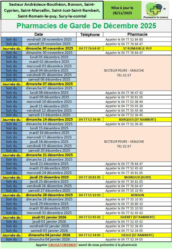 PHARMACIES DE GARDE - MOIS DE DÉCEMBRE 2025