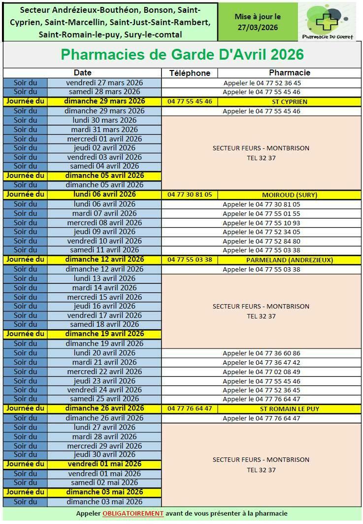 PHARMACIES DE GARDE - MOIS D'AVRIL 2026