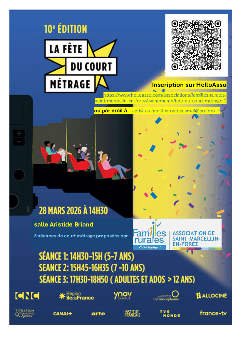 Votre mairie / Agenda / FAMILLES RURALES : FÊTE DU COURT MÉTRAGE SAMEDI 28 MARS APRES-MIDI