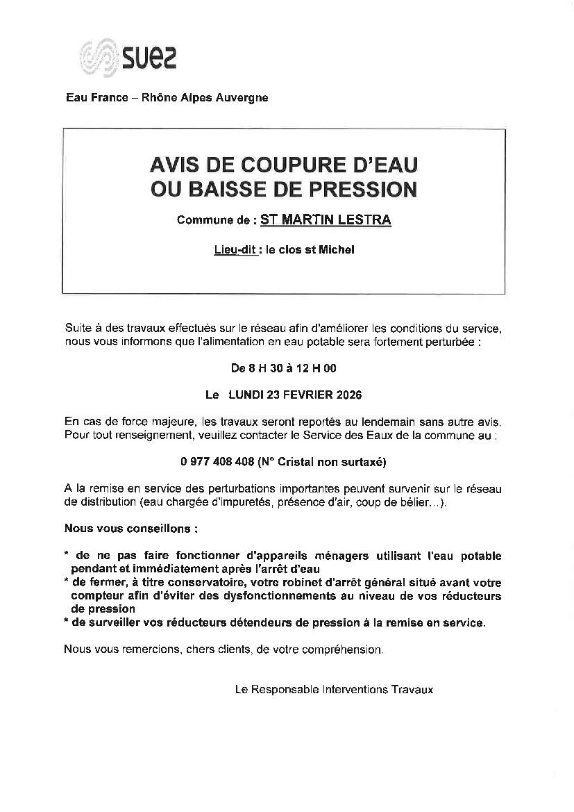 AVIS DE COUPURE D EAU LUNDI 23 FEVRIER - Le Clos St Michel
