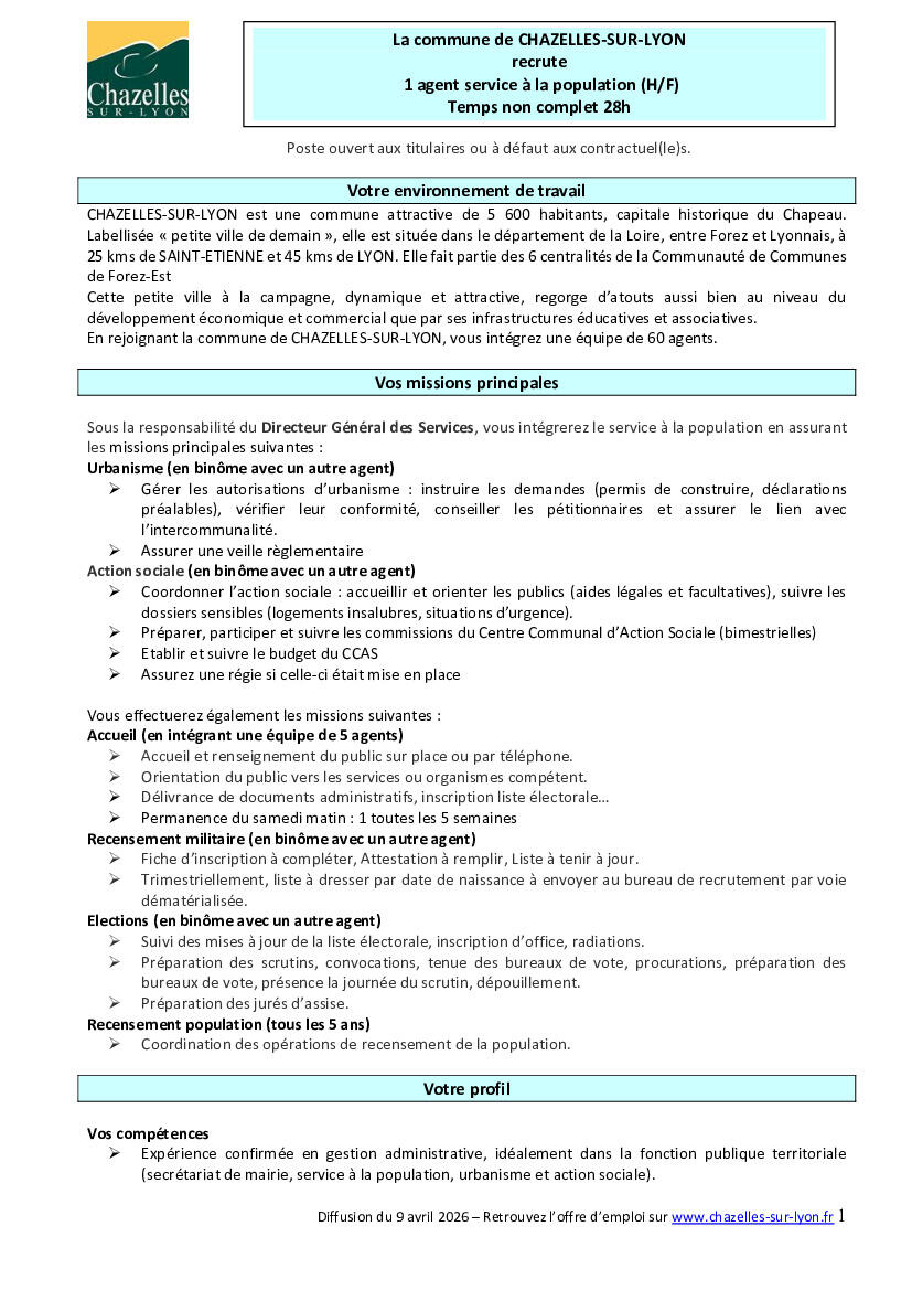 Votre mairie / Actualités / OFFRE D'EMPLOI CHAZELLES SUR LYON