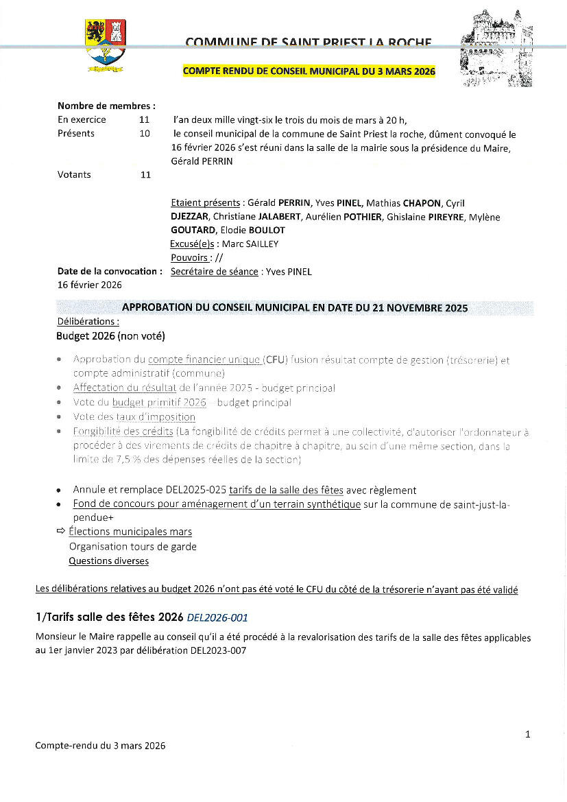 Le compte rendu du Conseil Municipal de Saint-Priest-la-Roche du 03 mars 2026 est en ligne sur le site internet de la commune en cliquant sur le lien ci-dessous 🌐
