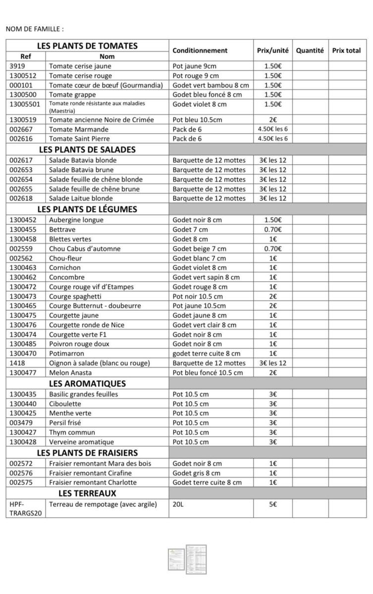 La commande est à rendre au plus tard le lundi 20 avril, pour une réception des plants le jeudi 7 mai de 16h15 à 18h.