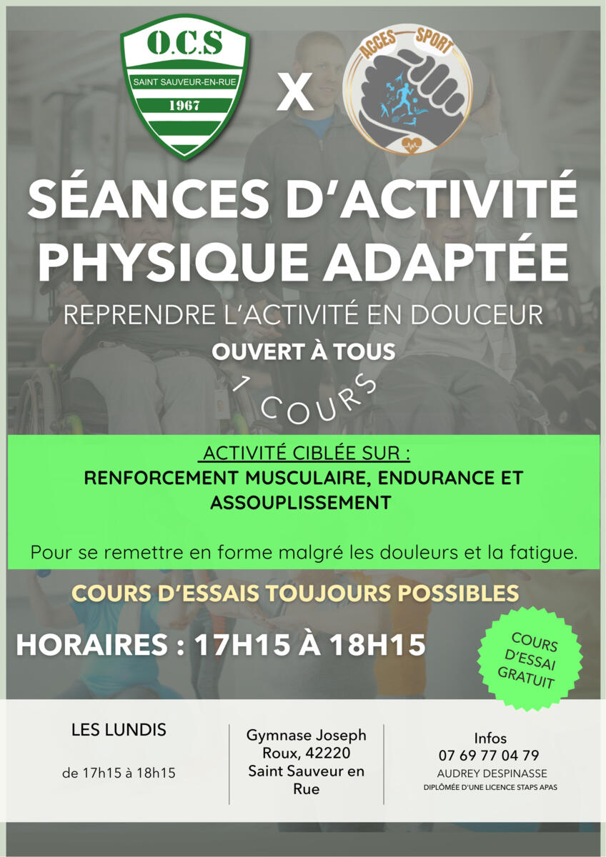 Séances d'activité physique adaptée tous les lundi de 17h15 à 18h15.