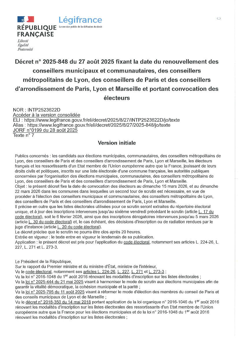 Prefecture Information Election Municipale 09/01/2026 INFORMATIONS : - Nombre de conseillers municipaux et communautaires à élire - Décret n)2025-848 du 27/08/2025 fixant la date du renouvellement des conseillers municipaux et portant convocation des électeurs.