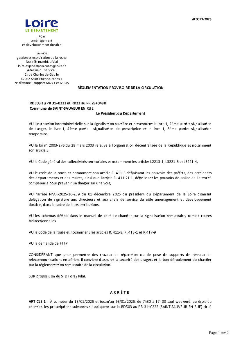 Règlementation Provisoire De La Circulation 09/01/2026 À compter du 13/01/2026 et jusqu'au 26/01/2026 sur la D 503 niveau du lieu-dit Chenerette