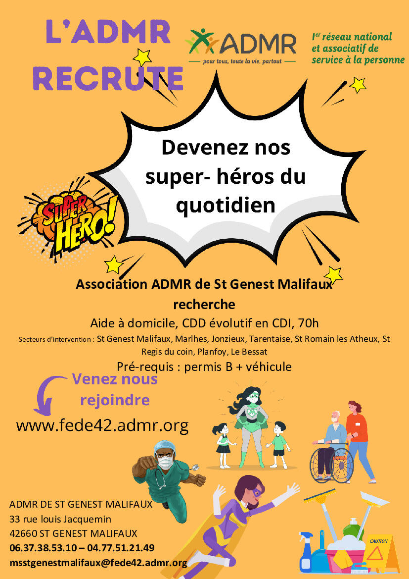 L’association ADMR de Saint-Genest-Malifaux recherche du personnel dès que possible.