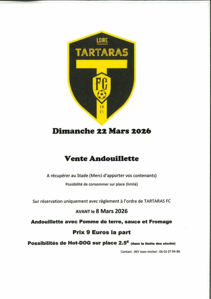 Message du Tartaras Football Club 05/03/2026 Dimanche 22 mars 2026 Vente d’andouillettes Source : Mairie de Tartaras