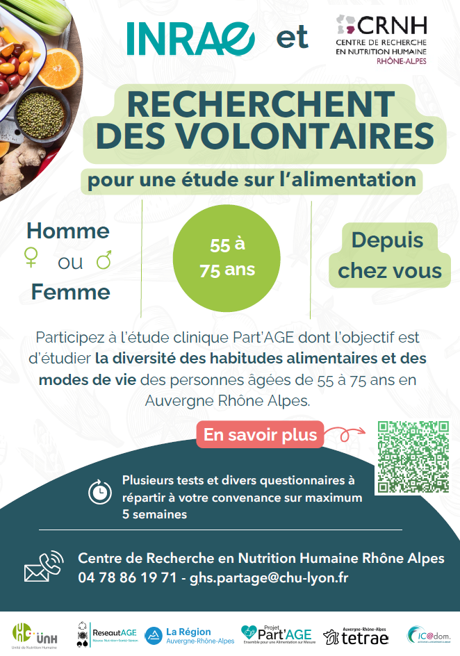 Projet PART'AGE 11/06/2025 Projet PART'AGE, co-porté par L' Unité de Nutrition Humaine de l'INRAE et le Gérontopôle Auvergne Rhône Alpes.