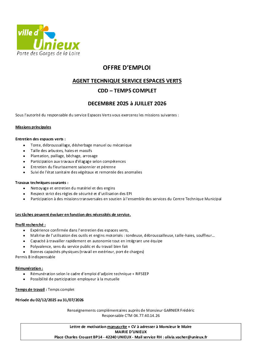 🔔 Offre d’emploi – Agent technique (Espaces Verts)