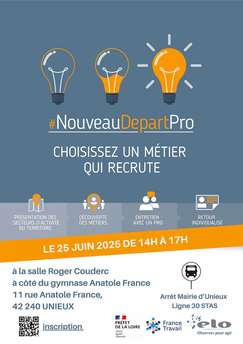 Une session d'information et d'orientation professionnelle aura lieu le mercredi 25 juin 2025 de 14h à 17h à la salle Roger Couderc à Unieux (à côté du gymnase Anatole France).